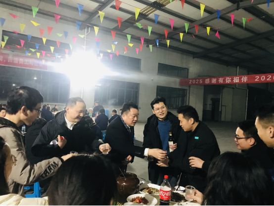 走進聚餐現場,喜慶的氛圍撲面而來。色彩鮮艷的彩旗迎風飄揚,靈動又熱烈,將現場的年味拉滿;醒目的橫幅高懸其上,字里行間承載著公司對全體家人的期許與祝福,每一處布置都藏著用心,每一縷氣息都透著團圓,讓遠離家鄉的伙伴們,也能感受到家一般的溫暖與歸屬感。